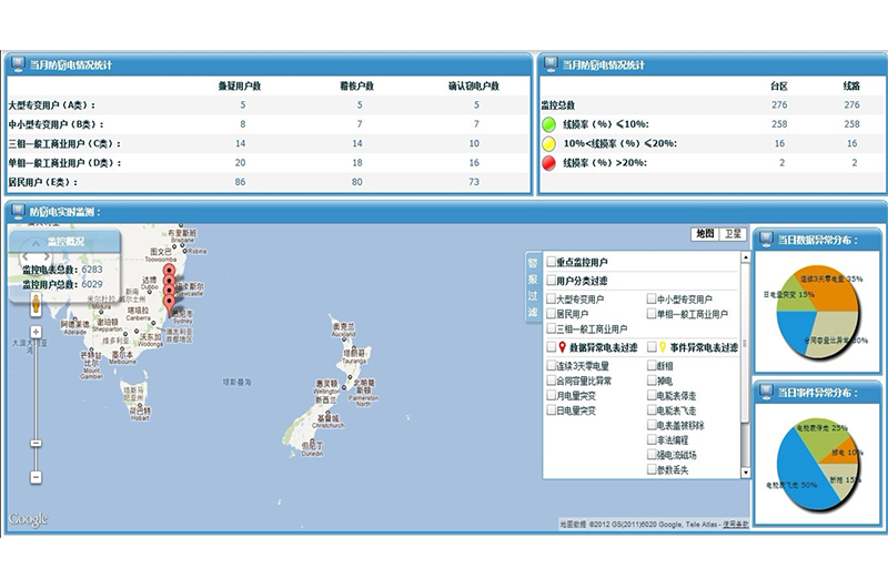 防窃电操控台集成了当月防窃电统计情况、防窃电实时监测地图等强大的功能,是反窃电管理人员便捷管理工具